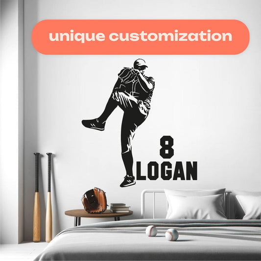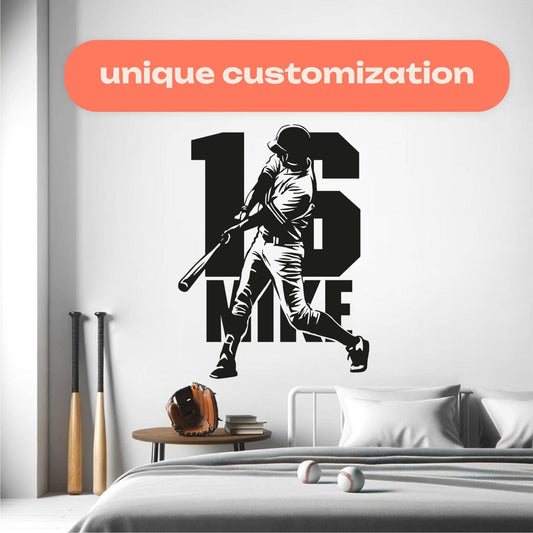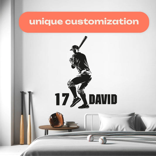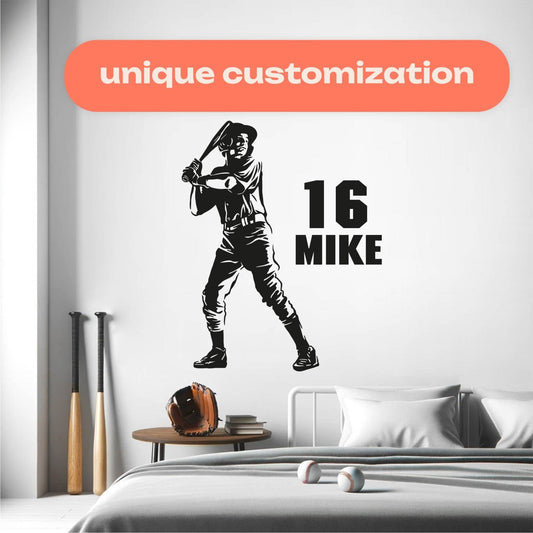 Elevate your little slugger's bedroom with a custom baseball wall decal from our collection. Each decal features a dynamic baseball player silhouette alongside their personalized name, creating a one-of-a-kind space that celebrates their passion for the game.