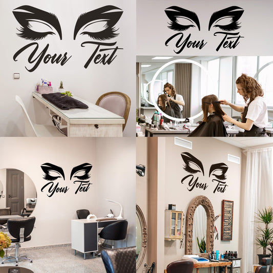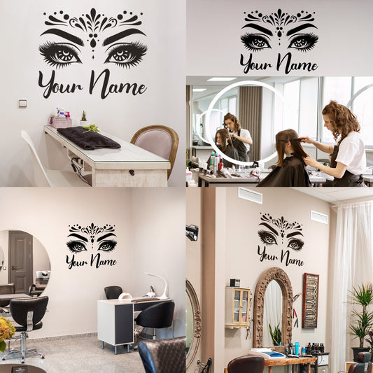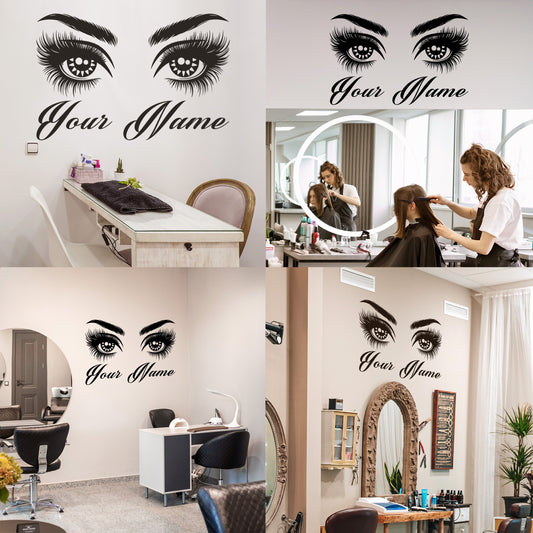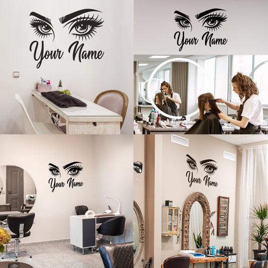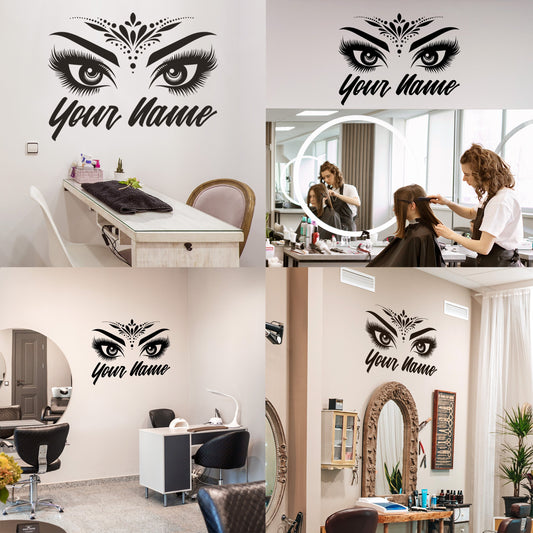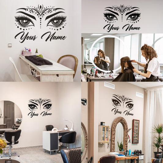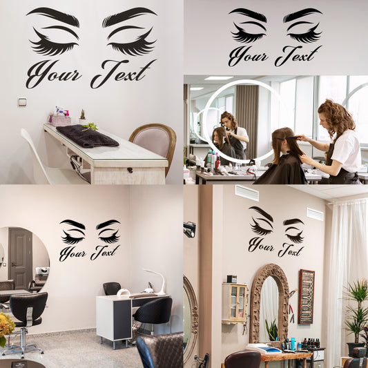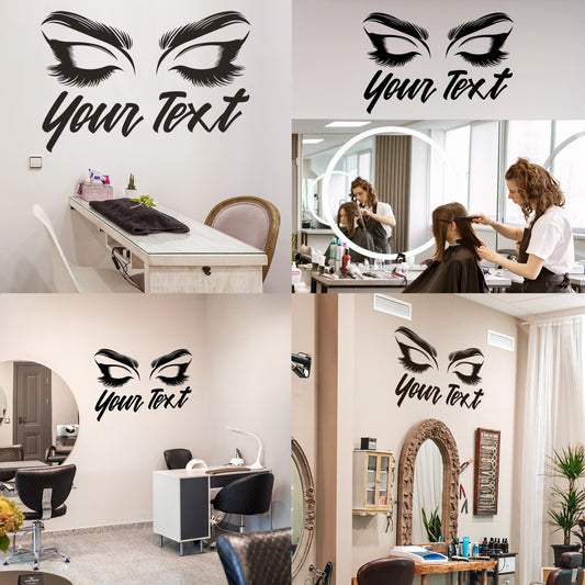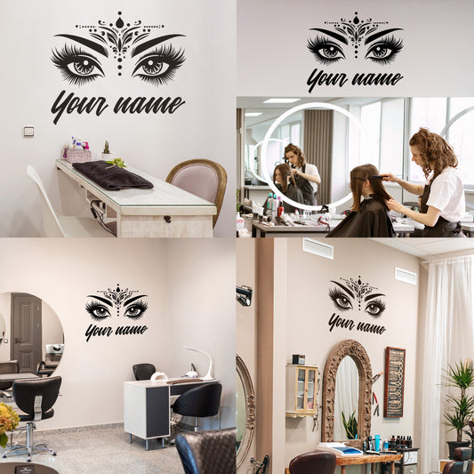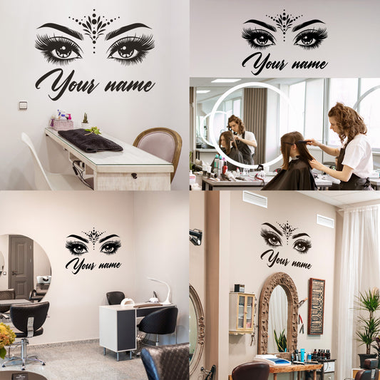 Wall Decal Butterfly eye and eyebrow with your text, name - personalized sticker for beauty salon - wall sticker for bedroom