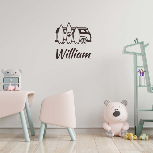 Personalized Name Stickers with Bus and Surfboards - Fade-Resistant Custom Name Stickers for Kids Bedroom - Easily-Applied Name Decals for Walls Doors Laptops