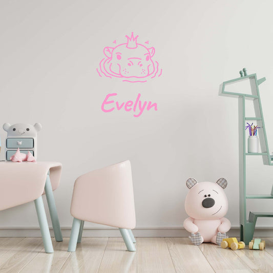 Personalized Name Stickers with Cartoon Hippo in Crown - Fade-Resistant Custom Name Stickers for Kids Bedroom - Lovely Name Decals for Walls Doors Laptops