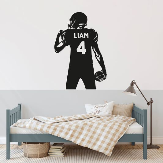 Personalized American Football Art Decal - Vinyl Wall Sticker Featuring Football Player and Ball - Customize with Your Name
